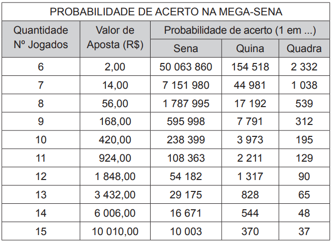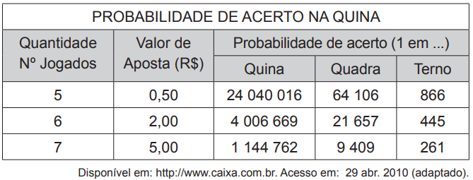 (ENEM 2011 PPL) José e Antônio discutiam qual dos dois teria mais chances de acertar na loteria. José tinha gasto R\$ 14,00 numa aposta de 7 números na Mega-Sena, enquanto Antônio gastou R\$ 15,00 em três apostas da quina, não repetindo números em suas apostas. Na discussão, eles consideravam a chance de José acertar a quadra da Mega-Sena e de Antônio acertar o terno da Quina.